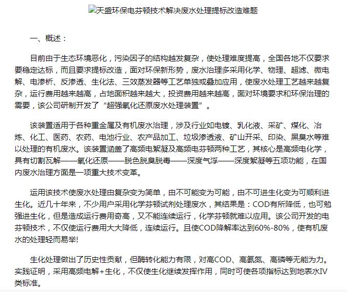 亞洲在線刊登:天盛環(huán)保電芬頓技術(shù)解決廢水處理提標(biāo)改造難題