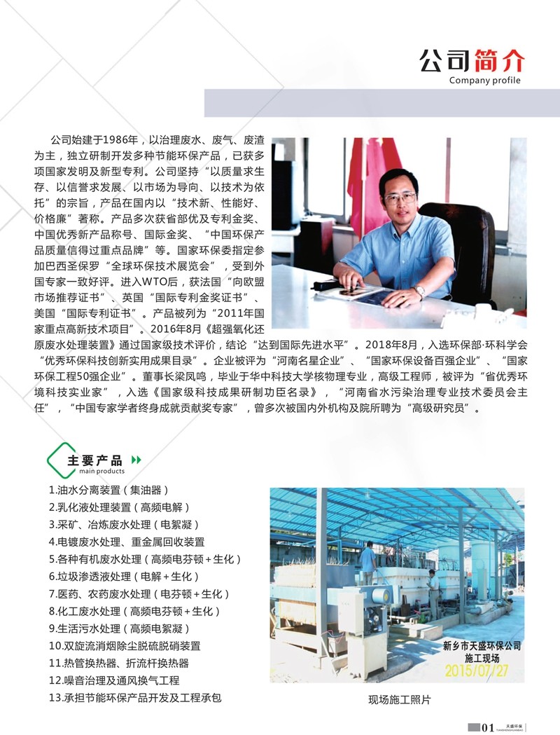 公司始建于1986年,以處理各種有機(jī)廢水、各種重金屬廢水為主,獨(dú)立研制開發(fā)多種節(jié)能環(huán)保產(chǎn)品,已獲多項(xiàng)國家發(fā)明及新型專利一種電化學(xué)廢水處理裝置 ZL 2013 2 0210949.5。公司堅(jiān)持“以質(zhì)量求生存、以信譽(yù)求發(fā)展、以市場為導(dǎo)向、以技術(shù)為依托”的宗旨。